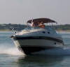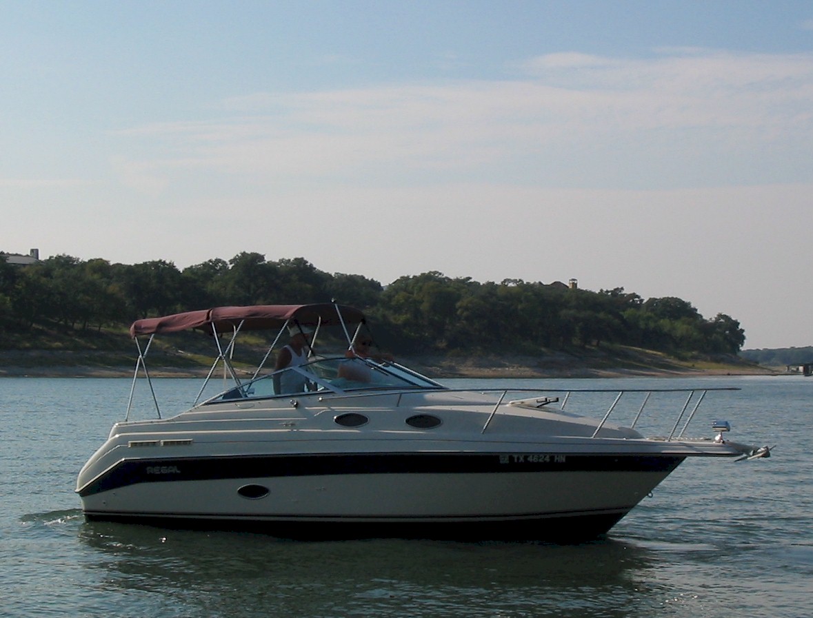 The Regal Valanti has a cabin layout that features a forward ''V''-shaped berth, a galley on the left and an enclosed head compartment at the right rear of the cabin. In addition, it has an midlevel sleeping compartment in the cabin. A pedestal-mount bucket seat for driver and an ''L''-shaped lounge for passengers. The cockpit lower rear area has a bench seat that pulls out of a back compartment. The big engine hatch lifts easily and provides good access to the engine with a pair of lift-out storage trays for storing bulky items. There is a large swim platform that is accessible through a door on the back of the boat with a under-the-platform stainless boarding ladder. Incorporated on the left side of the swim platform are storage slots for three big bumpers (fenders). Just inside the door, mounted inside the right side of the boat is a recessed space to hold the 25-quart cooler (included). The bridge seating arrangement is useful and comfortable. The pedestal helm chair turns easily for socializing with passengers on the rear lounge. The bridge allows good visibility and plenty of protection from the elements thanks to the curved-glass windshield. In a seated driving position, the boat also has good visibility, tilt steering, back-mounted instruments above the wheel where they are easily readable, digital depth indicator and a tray for cell phone, misc items, and stereo remote controller just below the gauges. On a sloping section to the left of the steering wheel is an electrical panel with switches and circuit breakers. The cabin arrangement layout incorporates a convertible berth, galley which includes Corian countertops, a Kenwood CD/MP3 cabin/cockpit stereo unit, enclosed head compartment and a midberth compartment. There is a microwave oven, refrigerator, one burner electric stove with a cutting board cover and a sink. Storage is available under cabin cushions, in the mini-closet, in cabnet below the sink, or the two bins above the stove and sink. The head compartment has the usual amenities: mirror, portable head, small sink, shower and storage spots. The rear sleeping compartment is roomy and comfortable as well. A smooth, solid ride with minimal water noise. |